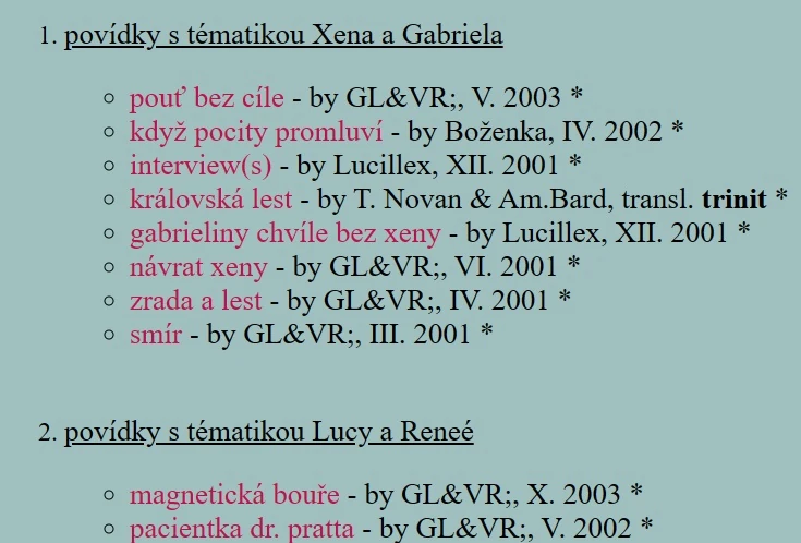 povídky na webu Realm of antisubtext (webarchiv, 2006), * značí, že v příběhu jde o lesbický vztah mezi postavami