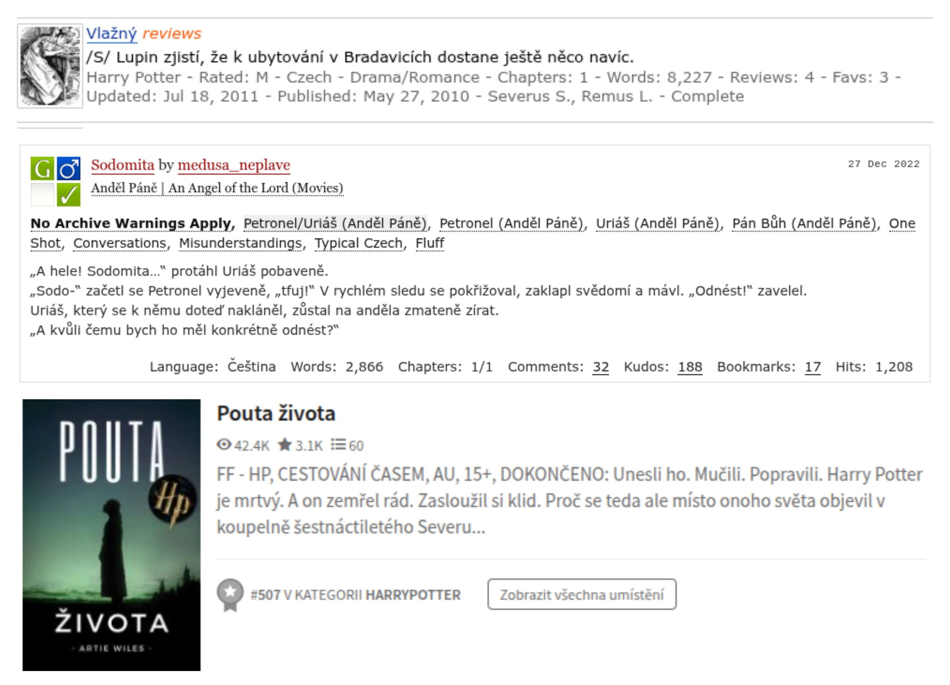 srovnání záhlaví tří největších automatizovaných archivů - FFnetu, AO3 a Wattpadu prostřednictvím tří fanfikcí - Vlažný, Sodomita a Pouta života.